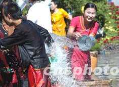 北京中華民族園十月國慶節期間各民族景區分別舉行傳統節日文化遺產展示活動,在傣族潑水節場地,各民族民眾以潑水形式祝福朋友的幸福和快樂。中新社記者:鄒憲