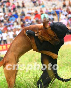 國慶佳節(jié)期間,貴州省凱里市由康偉經(jīng)貿(mào)發(fā)展公司舉辦的首屆東方斗牛大賽上,斗狗比賽異常激烈。中新社記者:宋吉河