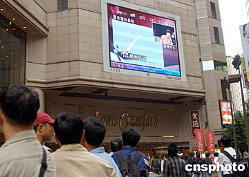 神舟五號(hào)飛船十月十五日順利升空,吸引香港市民云集時(shí)代廣場(chǎng)觀看電視新聞。中新社記者:潘索菲