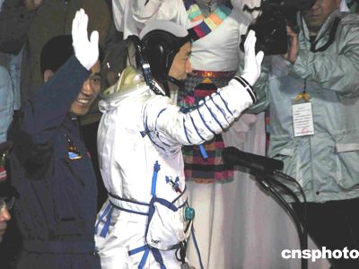 中國酒泉衛星發射中心為執行首次載人航天飛行任務的航天員楊利偉舉行出征儀式,圖為楊利偉向前來送行的人們揮手致意。中新社記者 孫自法 攝