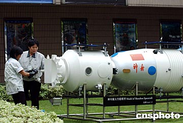香港太空館在廣場設置神舟五號模型。香港太空館10月15日舉辦“中國航天科技展覽”,并在廣場設置神舟五號模型供市民及游客參觀。作者:洪少葵