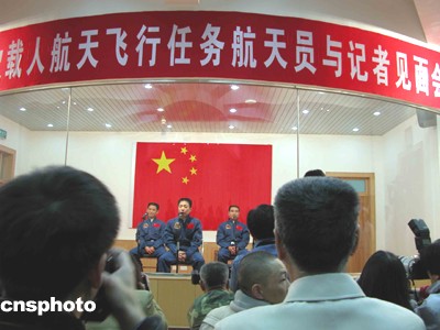 “神舟”五號載人飛船發射前夕,中國首次載人航天飛行航天員梯隊的三名航天員楊利偉(中)、翟志剛(右)聶海勝與記者見面,并回答記者提問。這也是中國航天員首次公開亮相。中新社記者孫自法攝