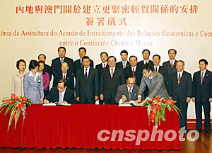 “內地與澳門關于建立更緊密經貿關系的安排”十七日下午在澳門特區政府總部舉行簽署儀式,國家商務部副部長安民和澳門經濟財政司司長譚伯源,分別代表中央政府和澳門特區政府在協議上簽字,國家副主席曾慶紅專程來澳出席了簽署儀式。