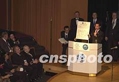17日晚在日本東京閉幕的第十八屆世界宇航員會議發表了一項由與會六十六名宇航員署名的共同宣言,呼吁世界各國以各自的成熟文化為今后的宇宙探險做出貢獻。圖為本屆大會主席之一的日本資深宇航員毛利衛在閉幕式上展示這份共同宣言。作者:王健