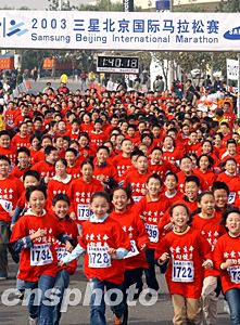 前不久在法國巴黎世界田徑錦標賽上取得一枚銅牌的孫英杰是二00三年三星北京國際馬拉松賽女子組唯一的奪冠“大熱門”。在比賽過程中,孫英杰始終處于領跑的第一集團之中,并于后半程脫穎而出,最終以二小時十九分三十九秒的成績輕松奪得女子組冠軍,創造北京國際馬拉松賽女子組歷史最好成績。