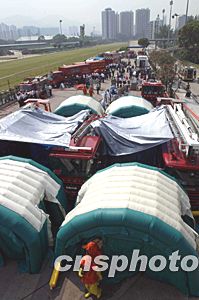 來自保安局、消防處、醫院管理局、醫療輔助隊、民安隊、天文臺、衛生署和賽馬會共1300多人參與此次演習。中新社記者:洪少葵