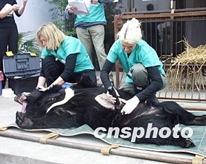 亞洲動物基金10月24日在成都中醫(yī)藥大學(xué)召開的“熊膽替代研討會”上宣稱,該基金正式啟動的“拯救黑熊、棄用熊膽”的熊膽替代宣傳教育系列行動揭開序幕,以讓更多的亞洲黑熊得到保護(hù)和救助,最終實(shí)現(xiàn)在中國淘汰活熊取膽業(yè)的目標(biāo)。圖為“四川龍橋黑熊救護(hù)中心”的外籍獸醫(yī)為剛從養(yǎng)熊場解救出的亞洲黑熊體檢。作者:魯彥