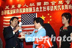 美東時(shí)間十一月六日晚,正在紐約訪問的中國(guó)國(guó)務(wù)院僑務(wù)辦公室主任陳玉杰出席了美東各界華僑華人為她率領(lǐng)的國(guó)僑辦代表團(tuán)舉行的聯(lián)合歡迎宴會(huì)席間,國(guó)僑辦主任陳玉杰向紐約僑胞贈(zèng)神舟五號(hào)飛船模型。中新社記者:陳建