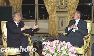 香港特區(qū)行政長官董建華十三日(巴黎時間十二日)會見法國總統(tǒng)希拉克(右),向他簡介香港的最新經(jīng)濟情況。作者:中新社