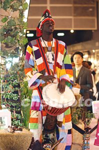 法國參展商出動黑人樂手擊鼓高歌助興美容展。中新社記者:洪少葵