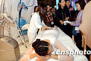 在香港舉行的“2003亞太區美容展”上,香港菲萊雅公司在現場推介美容和瘦身療法,吸引眾多愛美女士圍觀。中新社記者:洪少葵