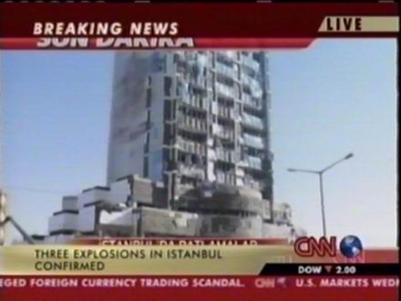 北京時間11月20日下午,位于土耳其伊斯坦布爾北部的土耳其匯豐銀行總部附近發生兩次爆炸,部分銀行建筑被摧毀。此后英國駐伊斯坦布爾領事館以及一個居民區和一座清真寺也遭到襲擊。圖為爆炸中被損毀的匯豐銀行。(春風)