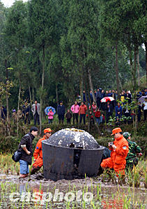 十一月二十一日,中國第十八顆返回式科學試驗衛星成功返回。西安衛星測控中心正在用直升飛機吊裝返回式衛星,準備送往指定地點。作者:孫陽