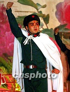 河南省安陽市超越集團(tuán)在日前舉辦的一場“非公經(jīng)濟(jì)之春”文藝晚會上,上演當(dāng)年樣板戲《智取威虎山》中的共產(chǎn)黨員形象。超越集團(tuán)有健全的共產(chǎn)黨組織健全。中新社記者:宋吉河