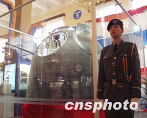“神舟”五號載人飛船返回艙成為此次展會上的亮點之一。中新社記者 余瑞冬攝