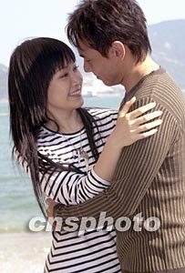 歌星黃凱芹、關心妍11月26日在香港赤柱正灘為無線電視拍攝音樂劇《愛在富豪海灣的日子》外景。圖為兩人一幕親熱鏡頭。作者:鄧慶樂