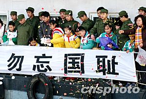 今天南京陽光明媚。但警報聲把人們帶回到六十六年前陰霾密布的恐怖氛圍中。隨著低沉的警報聲,人們低首默哀三分鐘,緬懷六十六年前遇難的同胞。集會上,千翼和平鴿騰空而起,表達了南京人民祈求和平的愿望。