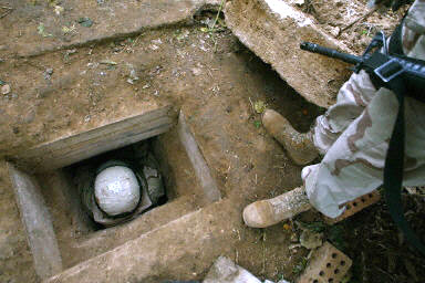 12月15日,在伊拉克提克里特附近,美軍第四步兵師士兵展示薩達姆被捕時藏身的地洞。