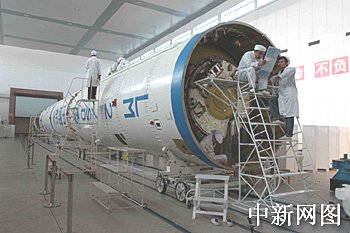 圖:"長征二號丙"改進型運載火箭在總裝廠房進行系統測試