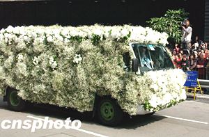 靈車幾乎全部被白色鮮花覆蓋,從殯儀館緩緩駛出時,馬路兩旁的歌影迷聲嘶力竭地呼喊著“梅艷芳”或“Anita”的名字,哭泣聲此起彼落,傳遍四周。