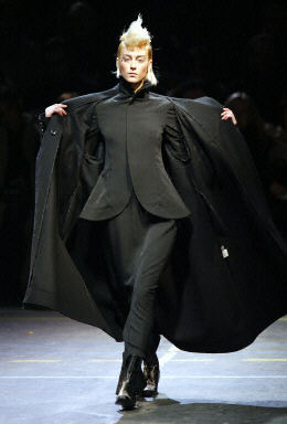 1月18日在法國巴黎,模特演繹了在服裝界中素有藝術家美稱的日本服裝設計師——山本耀司設計的2004春夏時尚女裝。