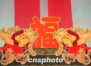 1月20日,安徽省淮北市街頭商場櫥窗內張貼出“金猴送福”年畫,小猴造型惹人喜愛。猴年將至,各類猴年年畫層出不窮。謝正義 攝