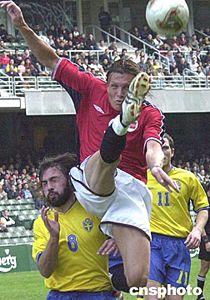 “2004嘉士伯杯”足球邀請賽元月二十二(農歷年初一)在香港大球場舉行,在首場比賽中瑞典隊與挪威隊對陣,圖為瑞典隊球星在場上展示精彩球技。作者:錢興強