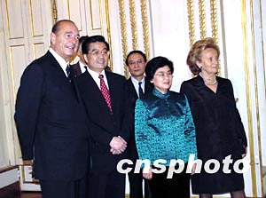 中國國家主席胡錦濤一月二十六日開始對法國進行為期三天的國事訪問,法國總統希拉克當日晚上在愛麗舍宮舉行國宴歡迎胡錦濤。圖為希拉克夫婦和胡錦濤伉儷共同會見來賓。作者:蔚中