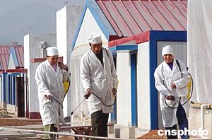 北京農業職業學院種雞場的員工對雞舍及周邊進行嚴格消毒,以防止禽流感發生。中新社記者:張宇