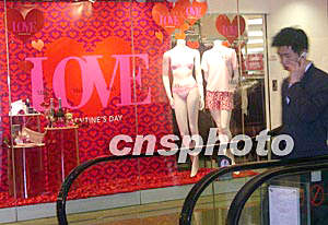 2月2日,香港一百貨公司櫥窗里寫上“LOVE”,并以性感內衣作招徠,象征濃情密意。雖然離2月14日的情人節還有些日子,但是商家的宣傳攻勢已經讓人感受到愛意撲面而來。作者:譚達明