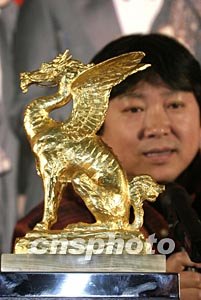 二月二十四日,獲得東京電影節“金麒麟”大獎的國產影片《暖》舉行媒體看片會,這部影片近期將在北京新開辟的藝術精品院線上映。圖為出席看片會的導演霍建起和金麒麟大獎。作者:高遠