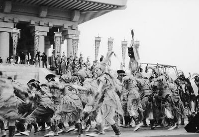 在此樂章中,各種道具將古老的巫舞和氏族的篝火舞相結合,服飾則采用了遠古時期的巖畫、圖騰紋、甲骨文和象形寫意。12名扮鳳凰的少女、12名扮各種動物的男子和12名頭戴圖騰面具的“部落首領”,手持羽毛編織的鳳旗、花桿等飾物,手牽手,揮舞著鳥羽、獸尾、圖騰柱踏歌而舞……