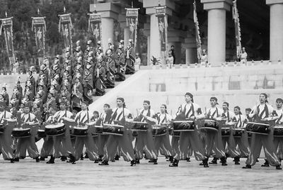 “咚、咚、咚——”,表現黃帝部落征戰、慶典和大戰場景的“中華鼓魂”響起來了,那是60名軍校學員敲起的撼天動地的“盤鼓”、“洛川蹩鼓”和“韓城行鼓”。最后,所有的鼓齊聚一起,管弦和笙簫推向最后的輝煌——氏族統一、華夏古國建立、軒轅被擁戴為黃帝。莊嚴、古樸的合唱《軒轅黃帝頌》響起。