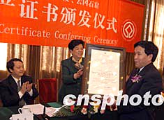 四月六日,來自云南、山西、北京、南京的代表歡聚北京人民大會堂,參加由中國聯(lián)合國教科文組織全國委員會等舉辦的世界遺產(chǎn)證書頒發(fā)儀式。國務(wù)委員陳至立向被列入聯(lián)合國教科文組織《世界遺產(chǎn)名錄》的云南“三江并流”、山西“云岡石窟”、北京“明十三陵”、南京“明孝凌”等的代表頒發(fā)了證書。中新社記者:任海霞
