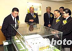 圖為澳門特區行政長官何厚鏵、中央駐澳門特區聯絡辦主任白志健等在新總部參觀第四屆東亞運動會場館模型。