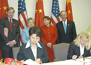 中美在四月二十一日結束的第十五屆中美商貿聯委會上,就“高技術出口最終用戶訪問”達成協議,這將推動美國對華高科技出口。圖為中國商務部副部長馬秀紅(左)與美國商務部副部長杰斯特(右)在簽字。作者:余東暉