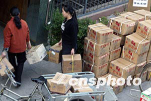 北京市出現新的SARS疫情后,許多批發商販聞風而動緊急進貨SARS消毒液。四月二十三日下午,北京西城區天意市場的一家商販將新進的“84消毒液”運進貨柜。“84消毒液”是北京地壇醫院研制的專門殺滅肝炎病毒的消毒液,對殺滅SARS病毒有明顯效果。中新社記者:任晨鳴