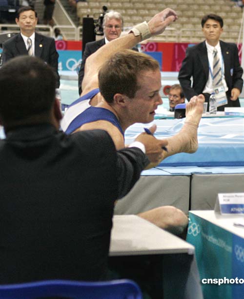 圖為奧運會男子體操全能比賽中,美國選手保羅-漢姆在跳馬項目中出現失誤,摔倒在一名裁判腿上。不過,最后他還是拿到了這個項目的冠軍。