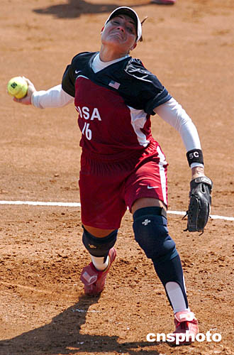 在當(dāng)?shù)貢r間8月19日舉行的壘球比賽中,美國隊選手里薩-費爾南德茲使出全身力氣奮力一投。