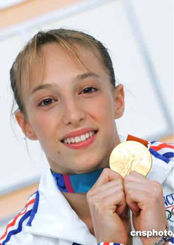在當地時間23日進行的女子體操個人器械比賽中,霍爾金娜出現重大失誤,法國選手勒配內奇取得高低杠項目的金牌。圖為她向觀眾展示金牌的鏡頭。
