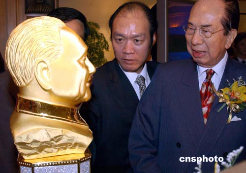 為紀念世紀偉人、中國改革開放的總設計師鄧小平先生百年誕辰,“金至尊”特別動員三十多人精心鑄造“鄧小平金至尊美鉆金像”,八月二十四日在香港舉行揭幕儀式,該像以2.8公斤黃金,5000顆總重量達100卡拉鉆石鑄造而成,總價值超過港幣一百萬。作者:錢興強