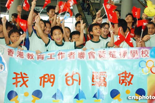 在香港國際機場舉行的歡迎儀式上,眾多香港小朋友舉著標語熱烈歡迎香港奧運代表團返港。作者:錢興強