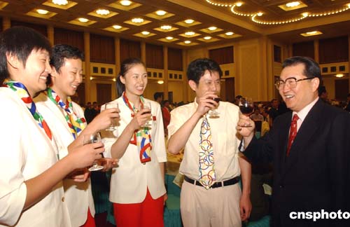 中共中央政治局常委李長春向獲得奧運冠軍的中國女排祝酒。中新社記者:武仲林