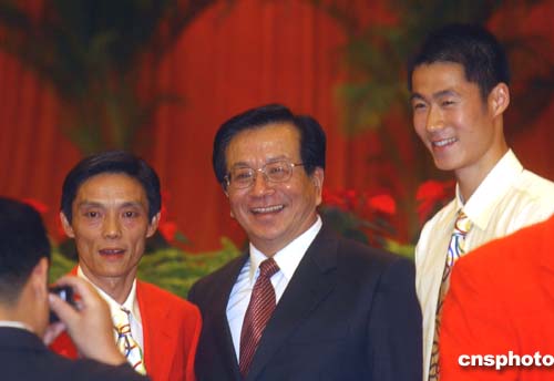 中共中央政治局常委、國家副主席曾慶紅與中國乒乓隊陸元盛、王勵勤合影留念。中新社記者:武仲林