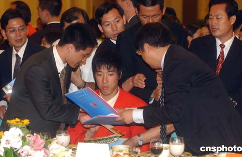 九月二日晚,中共中央辦公廳、國務(wù)院辦公廳在北京人民大會堂宴會廳舉行招待會,歡迎載譽(yù)歸來的第28屆奧運(yùn)會中國體育代表團(tuán)。圖為110米欄奧運(yùn)冠軍劉翔招待會上被眾多的體育迷包圍獲取簽名。中新社記者:武仲林