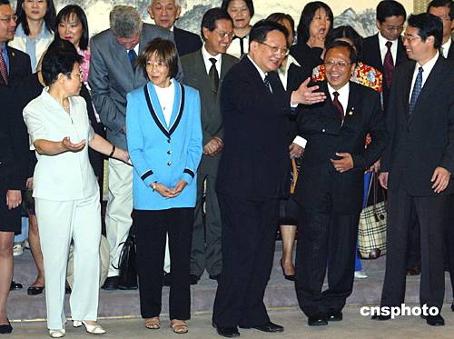 九月十日,國務(wù)委員唐家鏇在北京中南海紫光閣會見美加參政華人訪華團(tuán)全體成員。國務(wù)院僑辦主任陳玉杰(左前一)、副主任許又聲(右前一)陪同會見。中新社記者:鄭萍萍