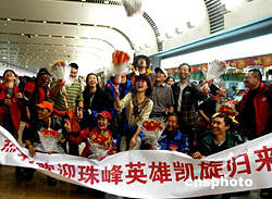 西藏自治區(qū)體育局、中國科學(xué)探險協(xié)會主辦的“珠穆朗瑪峰環(huán)保大行動”圓滿結(jié)束,十六日二十余名志愿者、新聞記者順利返回北京時,興高采烈地在首都機場合營留念,祝賀活動圓滿結(jié)束。中新社記者:宋吉河