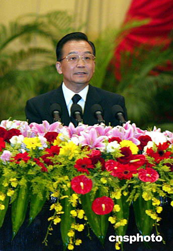 溫家寶總理在招待會上講話。他說,中國人民五十五年艱苦奮斗的光輝歷程,使我們從中得出一個(gè)最重要、最基本的結(jié)論,這就是:必須在中國共產(chǎn)黨的堅(jiān)強(qiáng)領(lǐng)導(dǎo)下,立足中國國情,順應(yīng)世界潮流,獨(dú)立自主地走中國特色的社會主義道路。