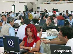 圖為在越南第五屆亞歐會議新聞中心內,眾多記者正緊張工作。中新社記者:吳慶才