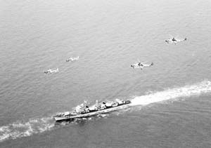驅逐艦部隊的戰斗力在提升,驅逐艦官兵走向深藍的決心和信心不斷增強。2002年5月15日,中華民族歷史上劃時代的一頁。由國產第二代驅逐艦“青島”艦擔任旗艦的海軍艦艇編隊,舉行了舉世矚目的環球航行,先后對新加坡、埃及、土耳其、烏克蘭、希臘、葡萄牙、巴西、厄瓜多爾、秘魯、法屬帕皮提港等10個國家的10個港口進行了友好訪問。艦艇橫跨三大洋、途經五大洲、6次穿越赤道,總計航程33126海里,歷時132天,在外軍和外國公眾及華人華僑面前,充分展示了我軍威武之師、文明之師、和平之師的良好形象。圓了中華民族的千年環球夢想,也實現了第一支驅逐艦部隊官兵走向深藍的夙愿。